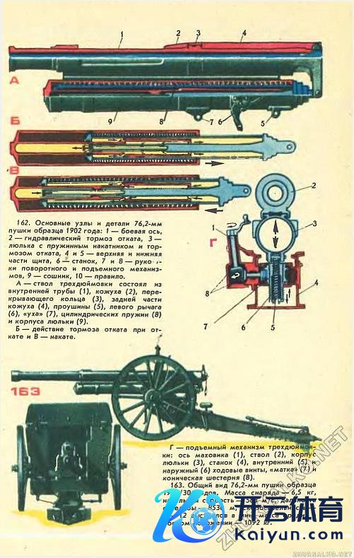 在射击时,炮管沿着固定的炮架移动,“槽形导轨”拉动了缓冲器的活塞,装配在炮架内的弹簧被压缩,射击后将炮管复原到原位。我将尝试用1988年《后生时间》杂志中的插图来诠释。
