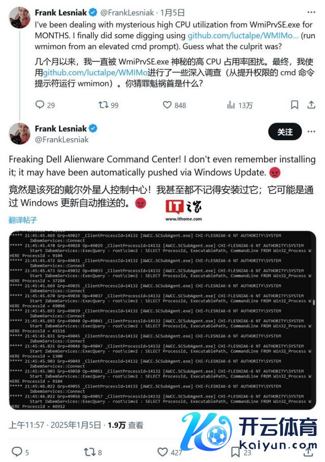 网友 Frank Lesniak 在 X 平台发布推文,暗示当年几个月间,一直困扰于他的 PC 会就地出现 CPU 负载过高的问题,进展为 WmiPrvSE.exe 进度占用 CPU 过高。IT 之家附上截图如下: